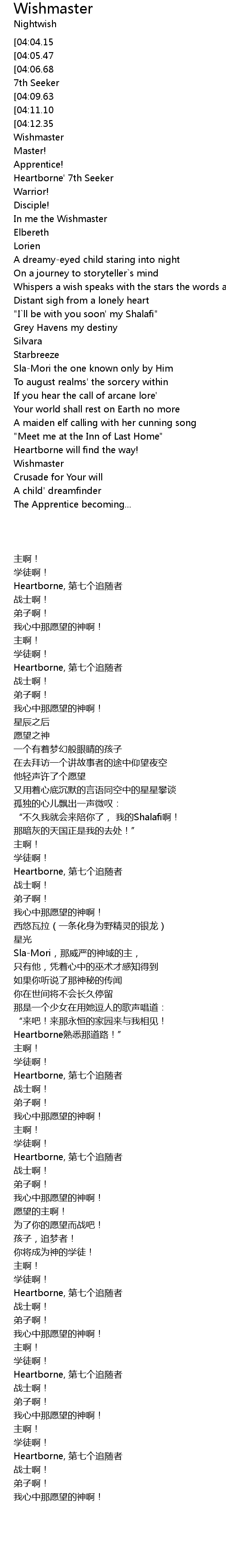 | [01:10.64][04:12.35][04:01.31][03:50.24][02:12.74][02:01.54][00:08.72] | In me the Wishmaster |