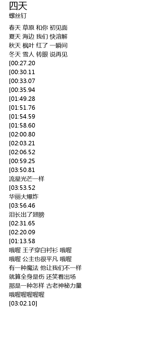 | [03:25.69][01:49.28][00:39.01] | 过了四天 对你的想念 |