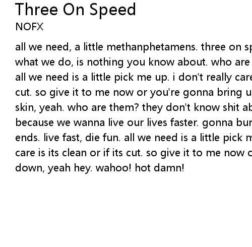 all we need, a little methanphetamens. three on speed. a little subversality. what we do, is nothing you know about. who are you? definently not one of us. all we need is a little pick me up. i don't really care is its clean or if its cut. so give it to me now or you're gonna bring us down, yeah hey. give me some skin, yeah. who are them? they don't know shit about us. different strokes, because we wanna live our lives faster. gonna burn the candle down at all three ends. live fast, die fun. all we need is a little pick me up. i don't really care is its clean or if its cut. so give it to me now or you're gonna bring us down, yeah hey. wahoo! hot damn!