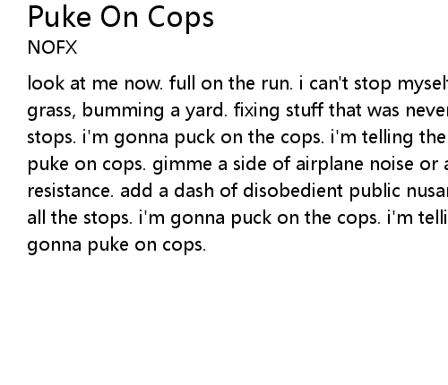 | look at me now. full on the run. i can't stop myself from crashing. breaking grass, bumming a yard. fixing stuff that was never broken. pulling out all the stops. i'm gonna puck on the cops. i'm telling the kids, punk rocks. i'm gonna puke on cops. gimme a side of airplane noise or a half a glass of our resistance. add a dash of disobedient public nusant, richtor riot. pulling out all the stops. i'm gonna puck on the cops. i'm telling the kids, punk rocks. i'm gonna puke on cops. |