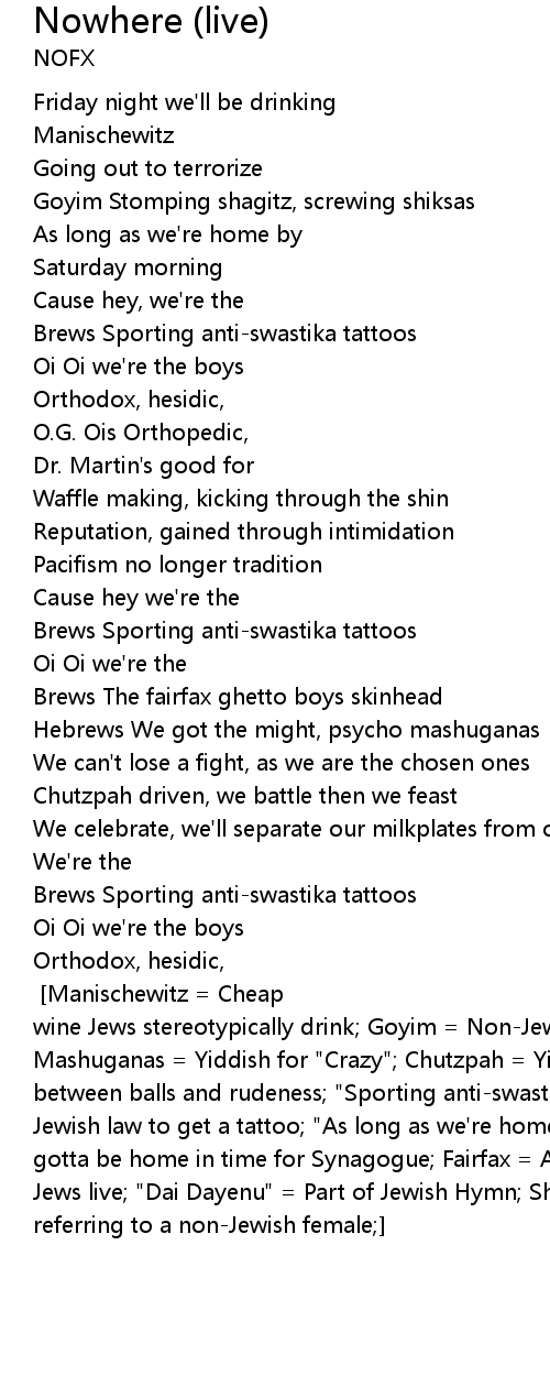 O.G. Ois [This is what some of the Jewish terms mean:] [Manischewitz = Cheap wine Jews stereotypically drink; Goyim = Non-Jewish people; Shagitz = Preppies; Mashuganas = Yiddish for "Crazy"; Chutzpah = Yiddish word meaning a cross between balls and rudeness; "Sporting anti-swastika tattoos" - It's against the Jewish law to get a tattoo; "As long as we're home by Saturday morning" - Jews gotta be home in time for Synagogue; Fairfax = A part of LA where the Orthodox Jews live; "Dai Dayenu" = Part of Jewish Hymn; Shiksa = Yiddish word for referring to a non-Jewish female;] |
