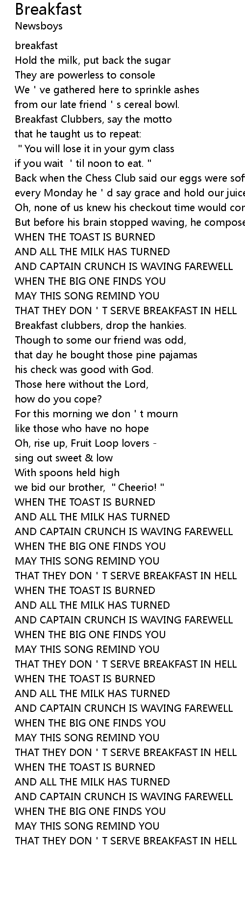 | [02:55.10] | THAT THEY DON T SERVE BREAKFAST IN HELL |