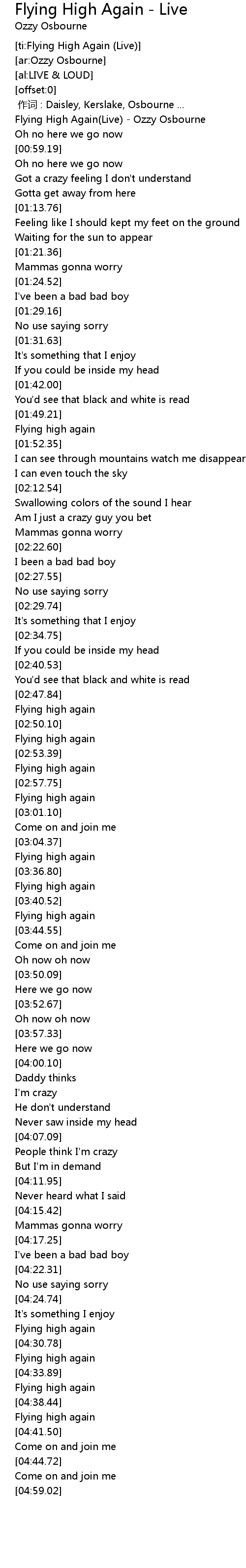 | [00:01.27] | Flying High Again(Live) - Ozzy Osbourne |