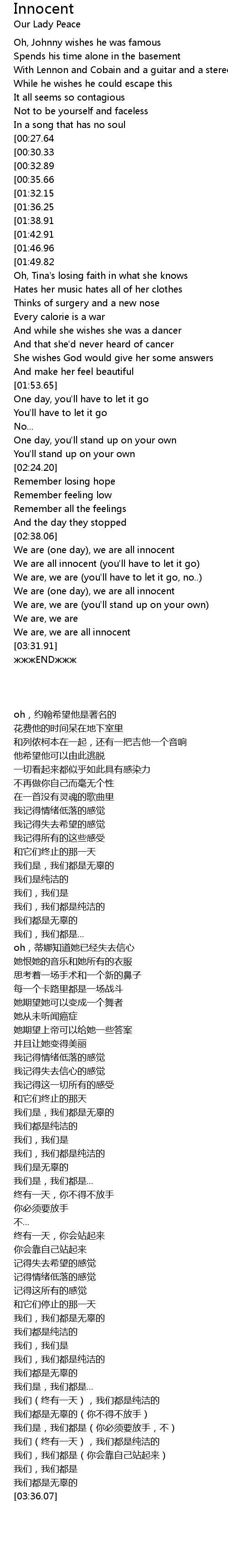 | [02:42.07][01:32.15][00:38.51] | We are, we are all innocent |