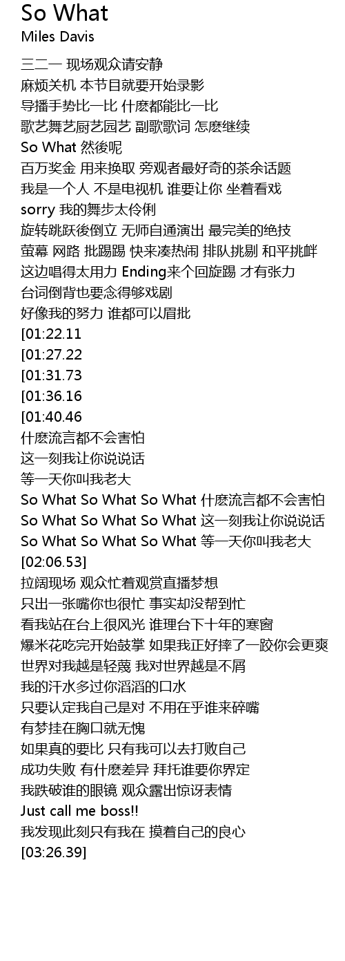 | [03:00.85][01:36.16] | So What So What So What 不代表要叫你老大 |