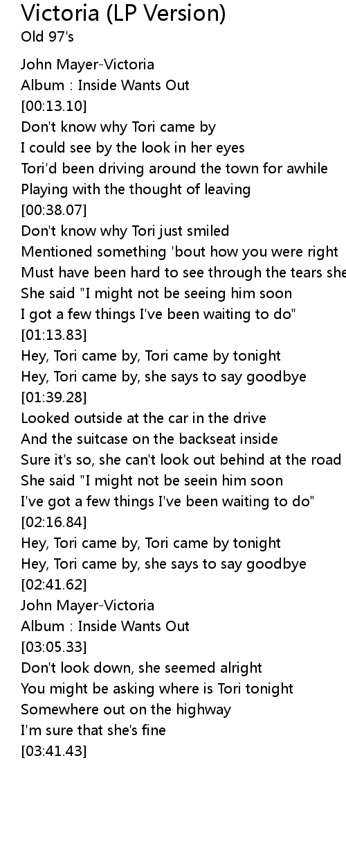 | [00:25.64] | Tori'd been driving around the town for awhile |