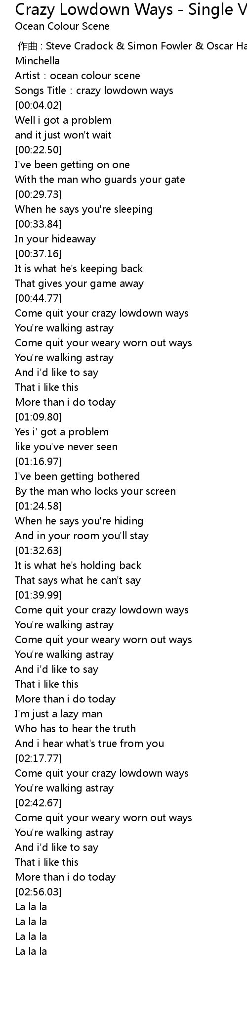 | [00:01.65] | Songs Title: crazy lowdown ways |