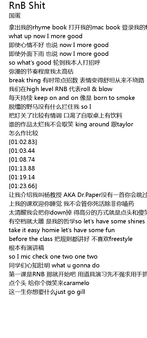 | [02:11.25][01:08.74] | xiang ting shui de RAP Shit song gei ta men wo de RNB shit |