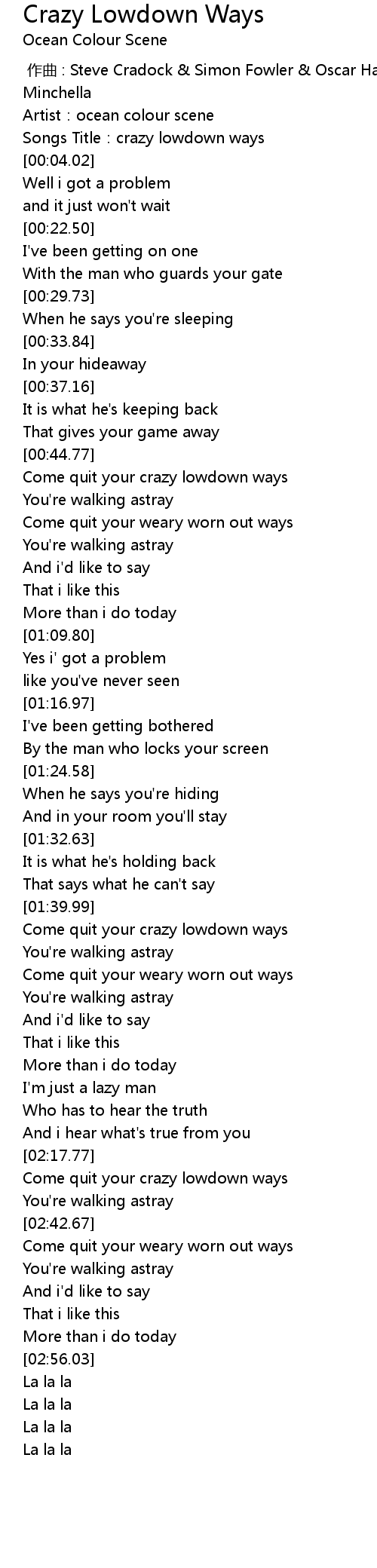 | [00:01.65] | Songs Title: crazy lowdown ways |