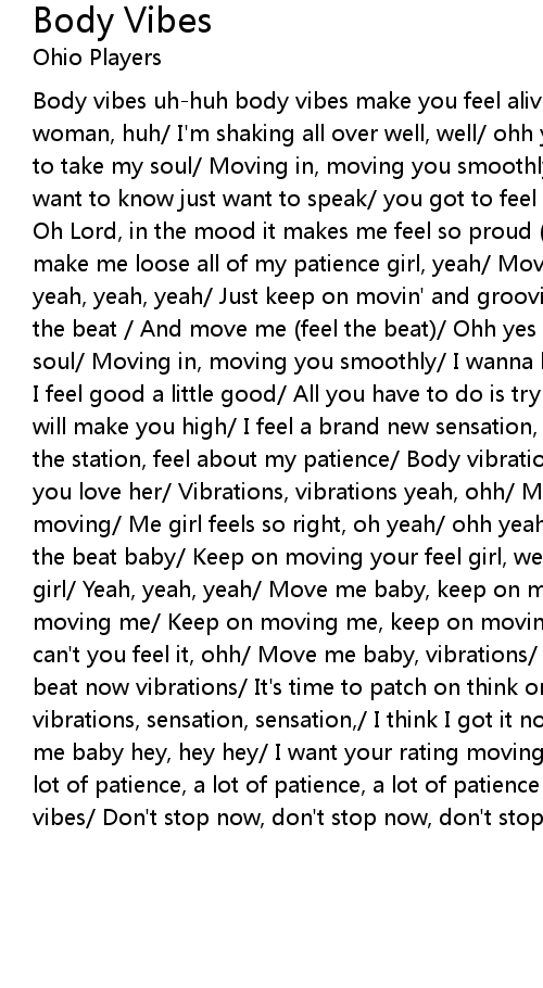 Body vibes uh-huh body vibes make you feel alive/ There ain't no jive, ohh woman, huh/ I'm shaking all over well, well/ ohh yes I wanna know, well/ Trying to take my soul/ Moving in, moving you smoothly/ It makes me feel so free/ I want to know just want to speak/ you got to feel my good body vibrations, well/ Oh Lord, in the mood it makes me feel so proud (ohh feels so proud)/ You bout to make me loose all of my patience girl, yeah/ Move me baby yeah, yeah, yeah ohh, yeah, yeah, yeah/ Just keep on movin' and groovin' me get down on me "G" feel the beat / And move me (feel the beat)/ Ohh yes I wanna know/ Trying to take my soul/ Moving in, moving you smoothly/ I wanna know just want to speak/ Feel you, I feel good a little good/ All you have to do is try I realize the/ body vibes will make you high/ I feel a brand new sensation, some new situation/ Feel about the station, feel about my patience/ Body vibrations, yeah, well, well, well Do you love her/ Vibrations, vibrations yeah, ohh/ Move me baby, woman keep on moving/ Me girl feels so right, oh yeah/ ohh yeah, yeah, yeah/ Can't you feel the beat baby/ Keep on moving your feel girl, well/ Can't you feel the beat, girl/ Yeah, yeah, yeah/ Move me baby, keep on moving me girl/ Yeah, yeah keep on moving me/ Keep on moving me, keep on moving me baby/ Woman you move me baby can't you feel it, ohh/ Move me baby, vibrations/ I think I think I feel the beat now vibrations/ It's time to patch on think on feet/ vibrations, vibrations, sensation, sensation,/ I think I got it now, c'mon vibrations/ Move me baby hey, hey hey/ I want your rating moving, I want your rating loving/ A lot of patience, a lot of patience, a lot of patience In the mood/ Ohh body vibes/ Don't stop now, don't stop now, don't stop now, Shucks! |