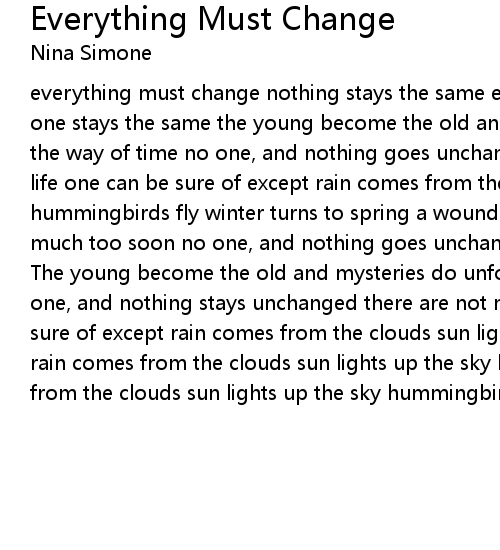 | everything must change nothing stays the same everyone will change no one, no one stays the same the young become the old and mysteries do unfold for that's the way of time no one, and nothing goes unchanged there are not many things in life one can be sure of except rain comes from the clouds sun lights up the sky hummingbirds fly winter turns to spring a wounded heart will heal oh but never much too soon no one, and nothing goes unchanged | |