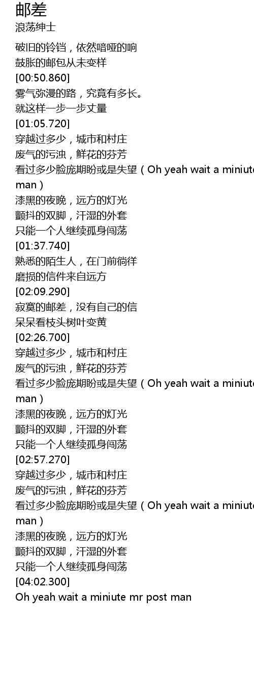 | [02:37.360] | kàn guò duō shǎo liǎn páng qī pàn huò shì shī wàng Oh yeah wait a miniute mr post man |