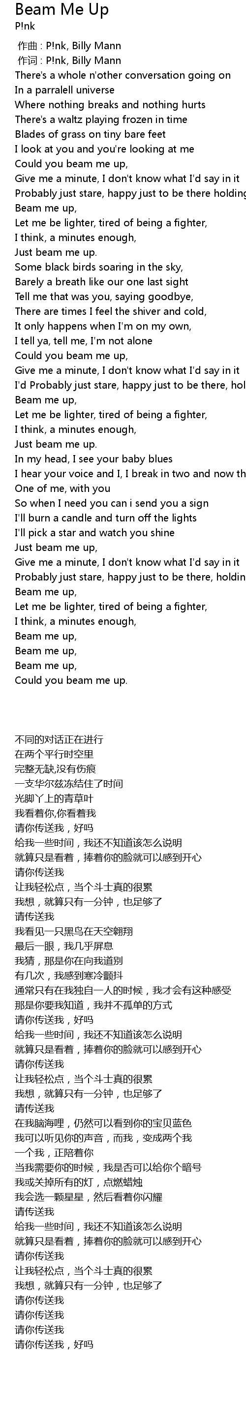 | [00:01.00] | 作词 : P!nk, Billy Mann |
