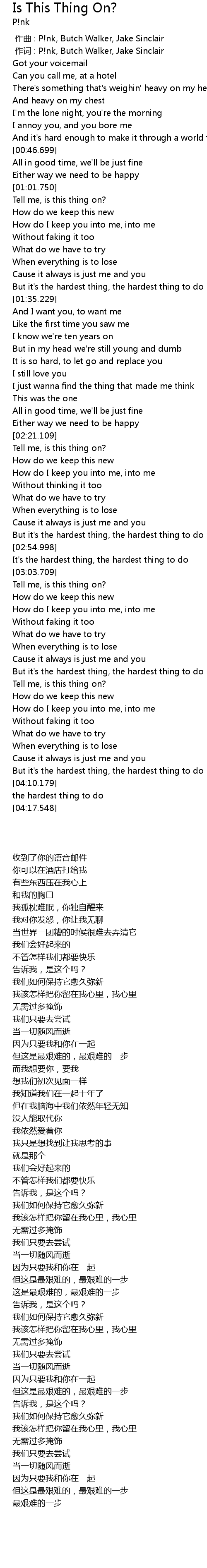 | [00:01.00] | zuo ci : P! nk, Butch Walker, Jake Sinclair |