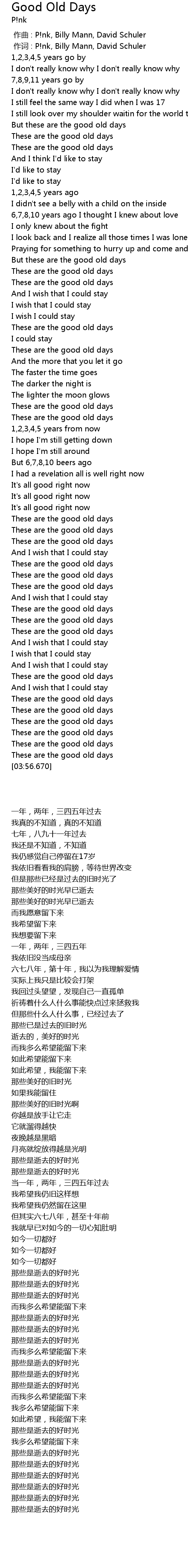 | [00:01.00] | 作词 : P!nk, Billy Mann, David Schuler |