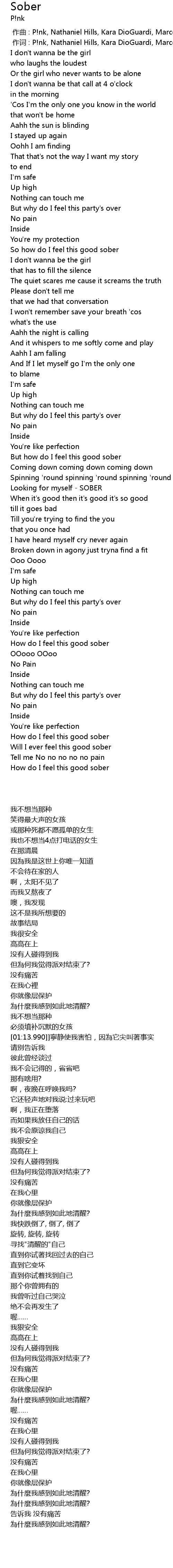 | [00:01.00] | 作词 : P!nk, Nathaniel Hills, Kara DioGuardi, Marcella Araica |