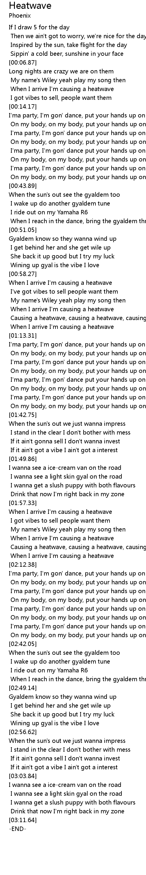 | [02:06.25] | Causing a heatwave, causing a heatwave, causing a heatwave |