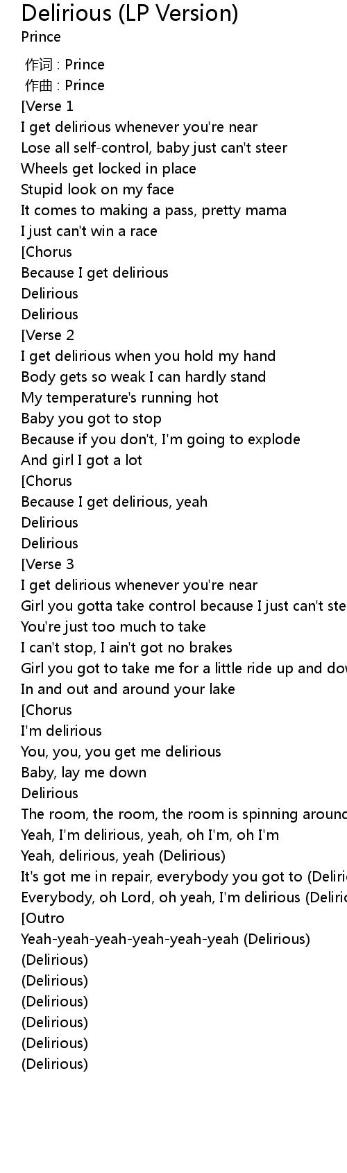 | [02:29.128] | Everybody, oh Lord, oh yeah, I' m delirious Delirious |