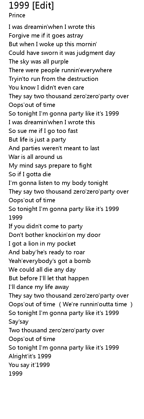 | [02:57.412] | So tonight I' m gonna party like it' s 1999 |