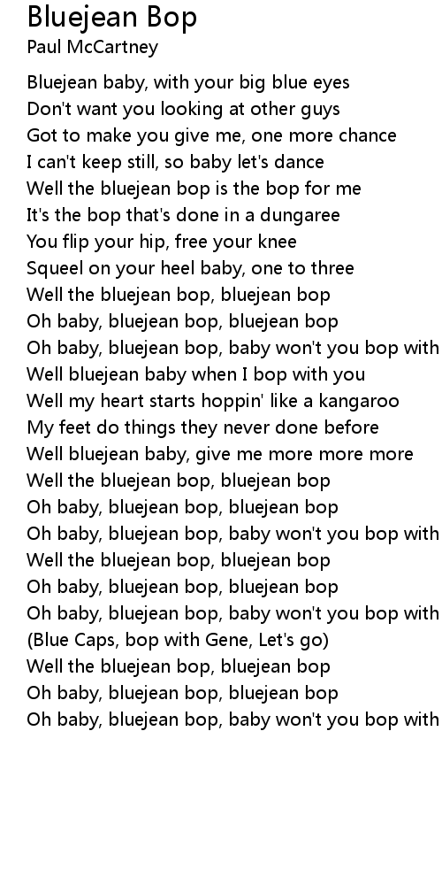 Oh baby, bluejean bop, baby won't you bop with Gene. (Bop Blue Caps, Bop)
