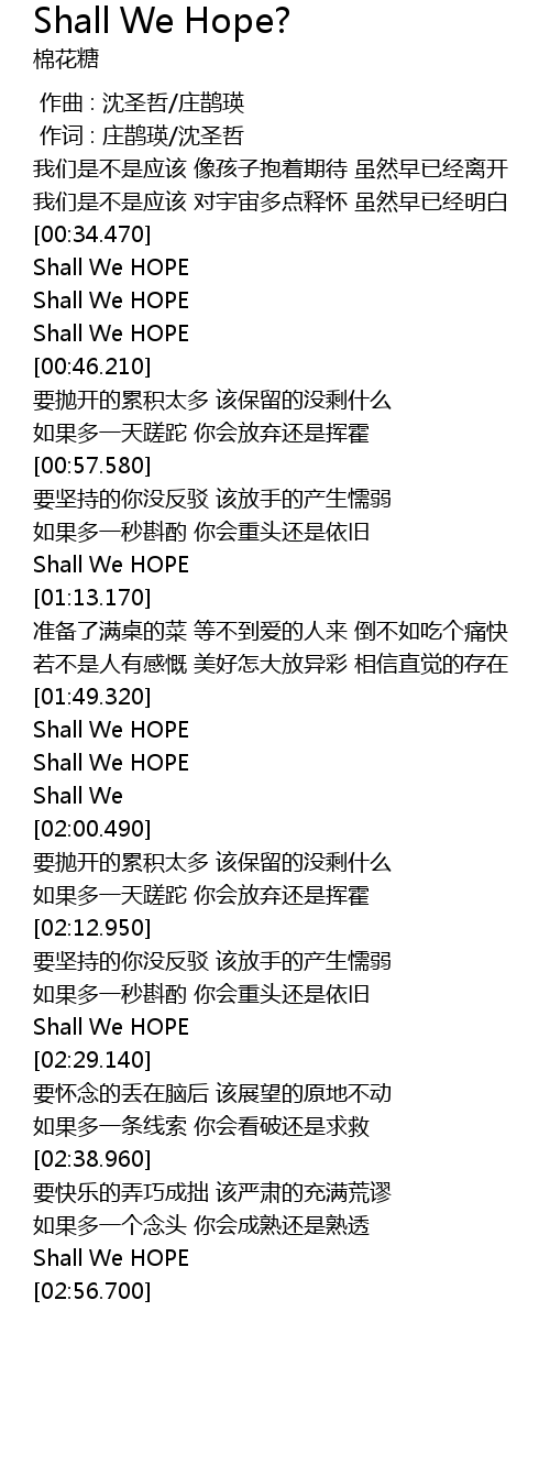 | [00:17.930] | 我们是不是应该 像孩子抱着期待 虽然早已经离开 |
