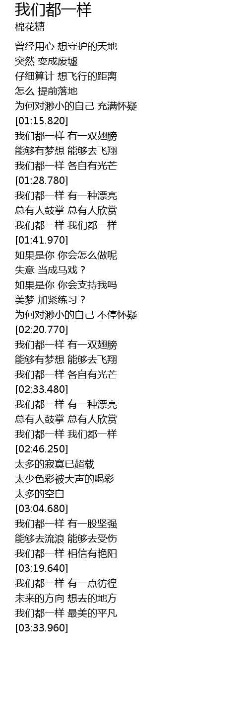 | [01:35.539] | wǒ men dōu yí yàng wǒ men dōu yí yàng |