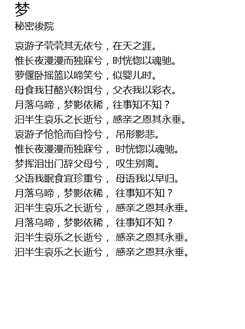 | [00:16.79] | 哀游子茕茕其无依兮,在天之涯。 |