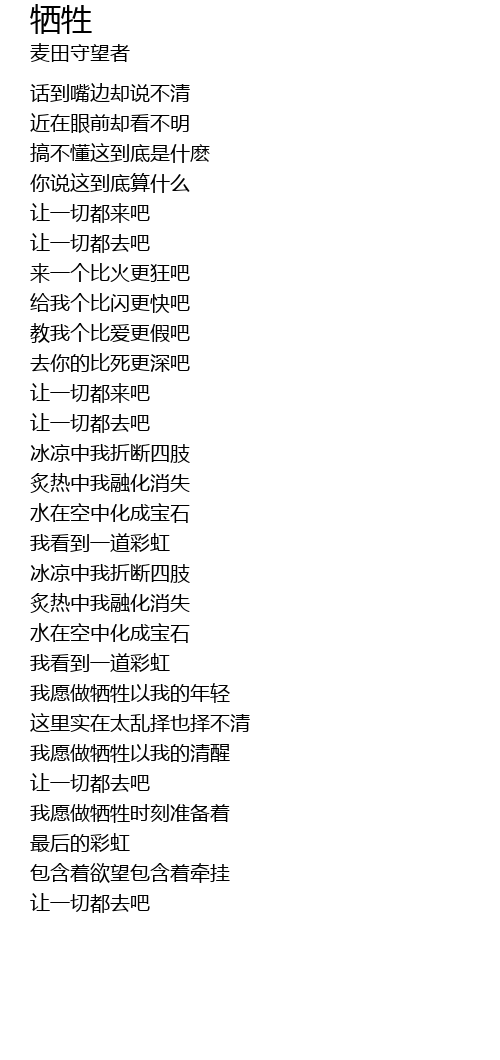 | [01:32.18] | 我愿做牺牲时刻准备着 |