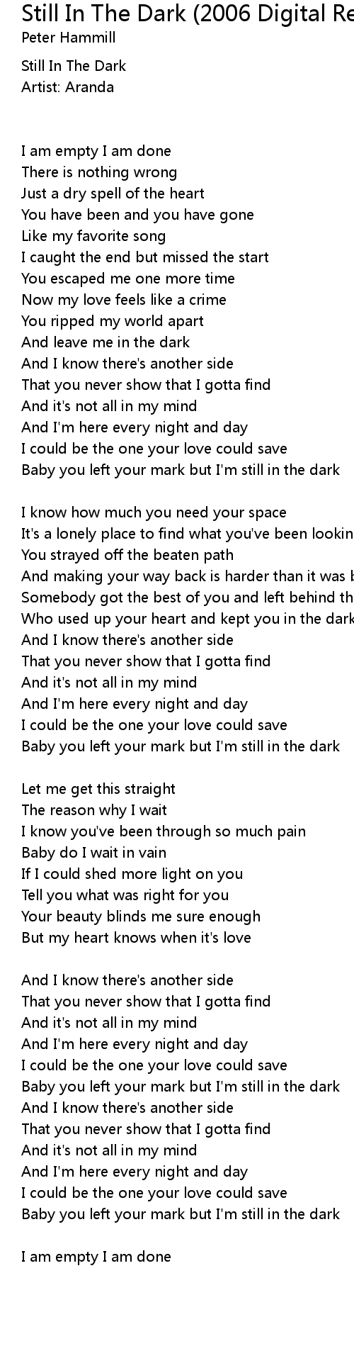 Baby you left your mark but I'm still in the dark |