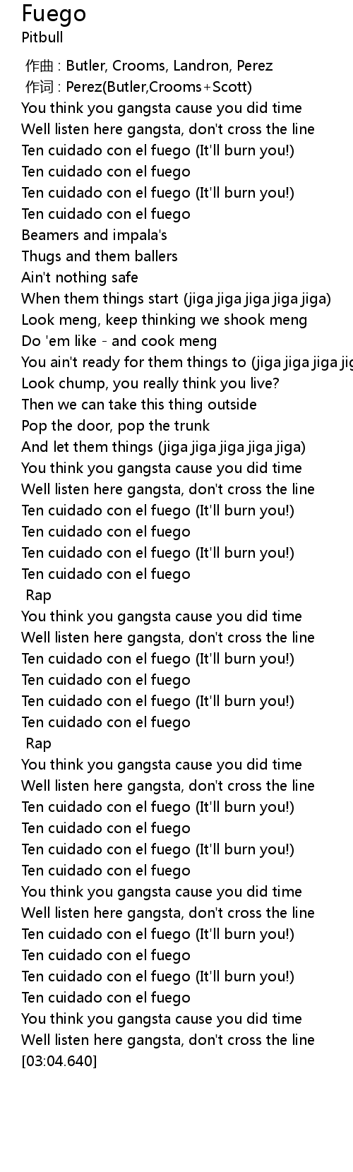 | [01:39.260] | Ten cuidado con el fuego (It'll burn you!) |