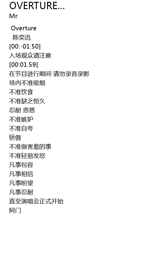 | [00:33.62] | zhí zhì yǎn chàng huì zhèng shì kāi shǐ |