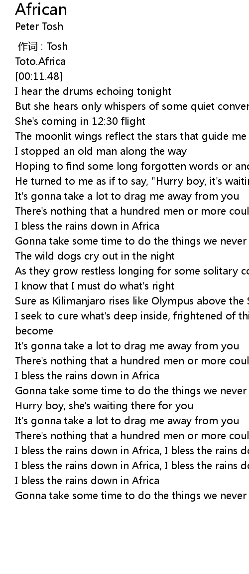 | [03:30.33] | I bless the rains down in Africa, I bless the rains down in Africa |