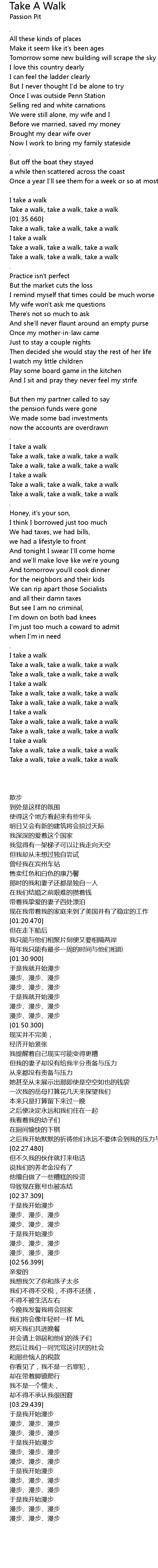 | [01:32.280] | Take a walk, take a walk, take a walk |