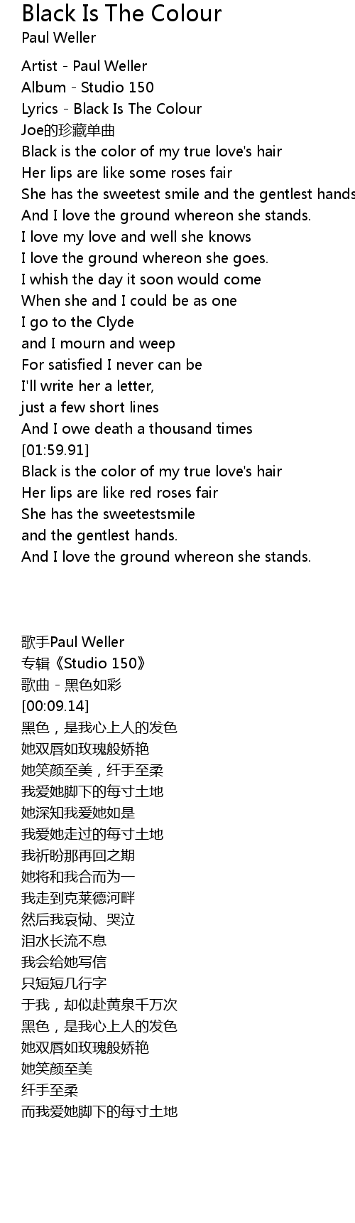 | [00:06.30] | Lyrics Black Is The Colour |