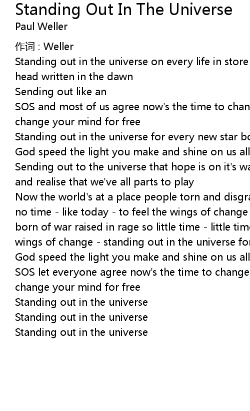 | Now the world's at a place people torn and disgraced there's no time - there's no time - like today - to feel the wings of change now the worlds at a stage born of war raised in rage so little time - little time like today to feel the wings of change - standing out in the universe for every new star born | |