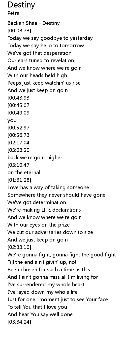 | [03:18.02][03:03.20][02:17.56][01:16.59][01:00.70] | Your DESTINY. Ain't turning back we're goin' higher |