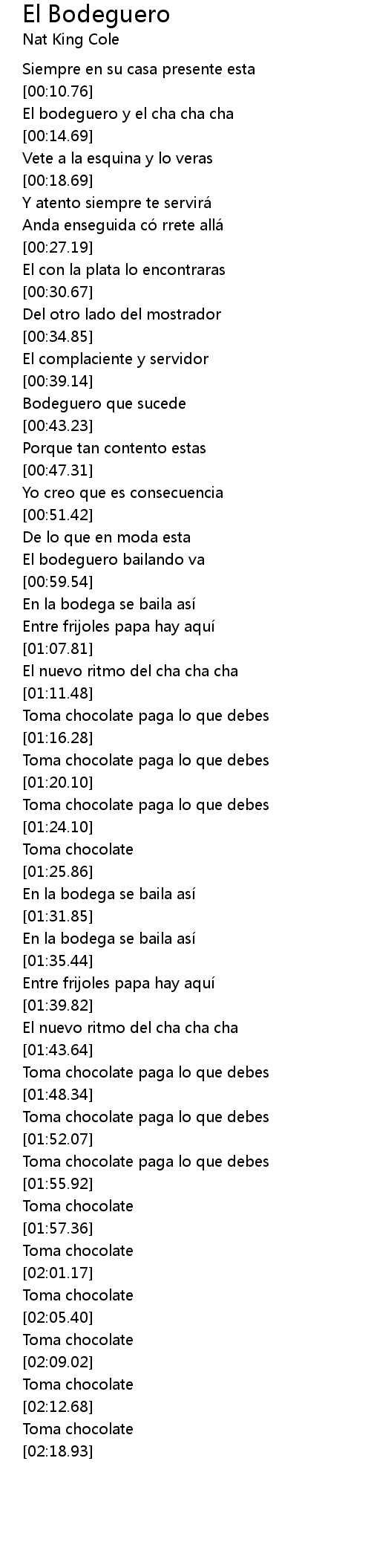 | [00:11.87] | El bodeguero y el cha cha cha |