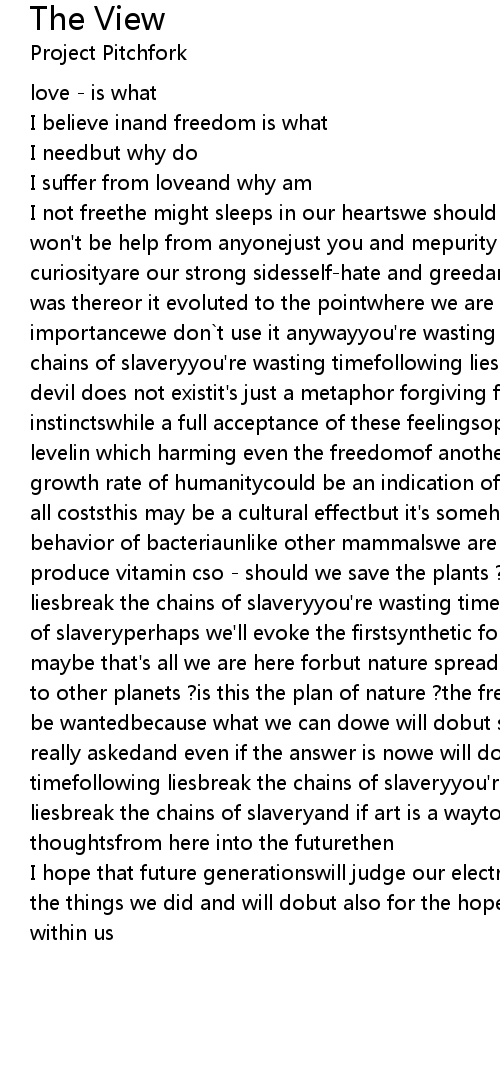 I not freethe might sleeps in our heartswe should form it with our handsthere won't be help from anyonejust you and mepurity and hopethe ability to loveand curiosityare our strong sidesself-hate and greedare our weaknessesspirit always was thereor it evoluted to the pointwhere we are nowbut its origin is not of importancewe don`t use it anywayyou're wasting timefollowing liesbreak the chains of slaveryyou're wasting timefollowing liesbreak the chains of slaverya devil does not existit's just a metaphor forgiving free rein to our animal instinctswhile a full acceptance of these feelingsopens a door to another levelin which harming even the freedomof another person turns into nonsensethe growth rate of humanitycould be an indication of our originmade to survive - at all coststhis may be a cultural effectbut it's somehow correspondingto the behavior of bacteriaunlike other mammalswe are living without the abilityto produce vitamin cso - should we save the plants ?you're wasting timefollowing liesbreak the chains of slaveryyou're wasting timefollowing liesbreak the chains of slaveryperhaps we'll evoke the firstsynthetic form of life on our planetand maybe that's all we are here forbut nature spreads everywherewill we bring life to other planets ?is this the plan of nature ?the freedom of choiceseems not to be wantedbecause what we can dowe will dobut should we ?this question is not really askedand even if the answer is nowe will do ityou're wasting timefollowing liesbreak the chains of slaveryyou're wasting timefollowing liesbreak the chains of slaveryand if art is a wayto transport feelings and thoughtsfrom here into the futurethen |