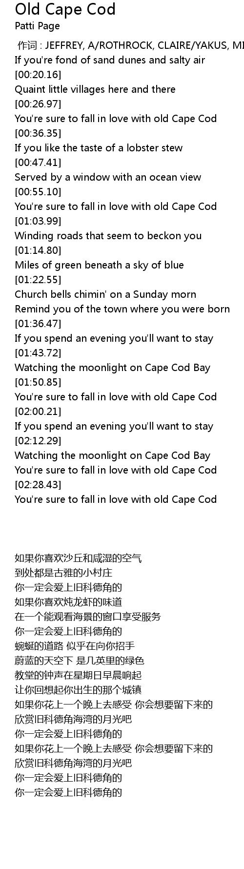 | [00:56.22] | You're sure to fall in love with old Cape Cod |