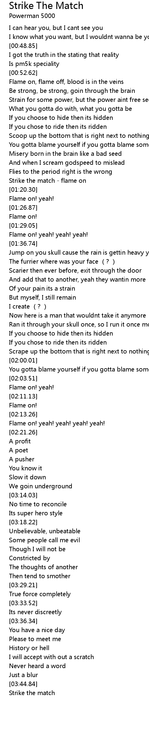 | [00:53.87] | Flame on, flame off, blood is in the veins |