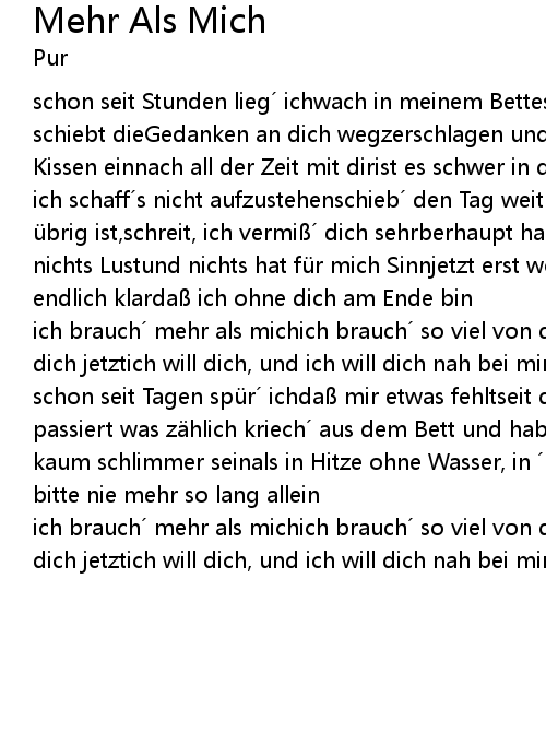 | ich brauch´ mehr als michich brauch´ so viel von dirund ich will dich, will dich jetztich will dich, und ich will dich nah bei mir |