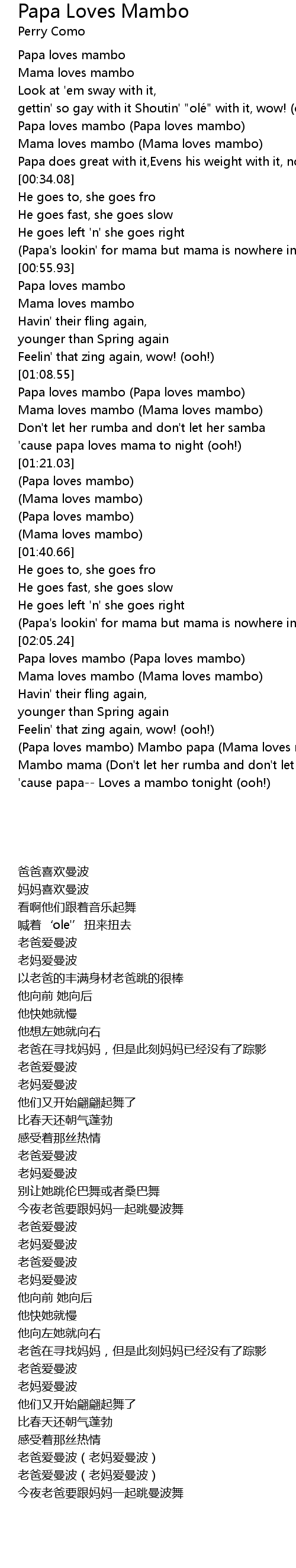 | [02:18.56] | Papa loves mambo Mambo papa Mama loves mambo |