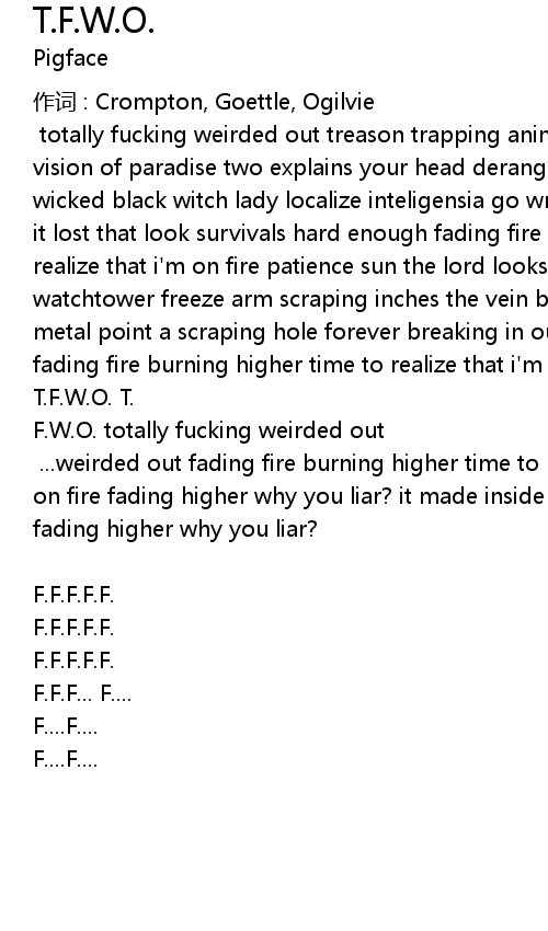 | T. F. W. O. x3 ... weirded out fading fire burning higher time to realize that i' m on fire fading higher why you liar? it made inside my brain i don' t remember fading higher why you liar? | |