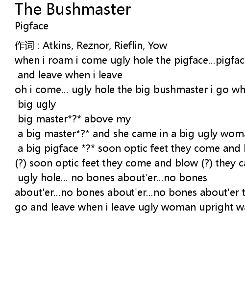 | when i roam i come ugly hole the pigface... pigface... pigface... no bones about' er i am the bushmaster i go where i go UGLY HOLE! and leave when i leave oh i come... ugly hole the big bushmaster i go where i go and leave when i leave the big bushmaster i go where i go and leave when i leave ugly hole big ugly woman... pigface... and upright walkin' smell like ? x3 big master? above my head no bones about' er a big master? and she came in a big ugly woman and she came in a big pigface a big pigface ? soon optic feet they come and blow ? soon optic feet they come and blow ? they can' t overcome they can' t overcome... ohhh... ugly hole ugly hole... no bones about' er... no bones about' er... no bones about' er... no bones about' er the big bushmaster i go where i go and leave when i leave ugly woman upright walkin' smell like bookburnin'? |