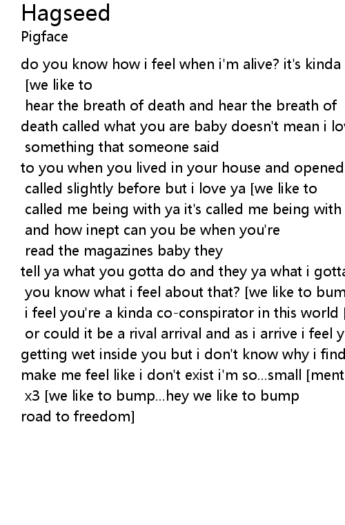 do you know how i feel when i'm alive? it's kinda like you giving me sex and you know no one gives me sex [we like to bump...hey we like to bump] [we like to bump...hey we like to bump] hear the breath of death and hear the breath of death called what you are baby doesn't mean i love ya it just means it's what we are remember [we like to bump...hey we like to bump] something that someone said to you when you lived in your house and opened the front door [we like to bump...hey we like to bump] called slightly before but i love ya [we like to bump...hey we like to bump] called me being with ya it's called me being with you [we like to bump...hey we like to bump] and how inept can you be when you're making love [we like to bump...hey we like to bump] read the magazines baby they tell ya what you gotta do and they ya what i gotta do [we like to bump...hey we like to bump] you know what i feel about that? [we like to bump...hey we like to bump] i feel you're a kinda co-conspirator in this world [we like to bump...hey we like to bump] or could it be a rival arrival and as i arrive i feel you getting wet inside you but i don't know why i find you so appealing 'cause you make me feel like i don't exist i'm so...small [mental illness is the road to freedom] x3 [we like to bump...hey we like to bump] x2 [mental illness is the road to freedom] |