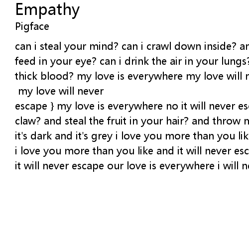 can i steal your mind? can i crawl down inside? and when i am your child can i feed in your eye? can i drink the air in your lungs? and can i breath your sweet thick blood? my love is everywhere my love will never escape i love your body and mind i will never escape my love is everywhere } [x2] my love will never escape } my love is everywhere no it will never escape and can i take out the claw? and steal the fruit in your hair? and throw my body inside? down where it's dark and it's grey i love you more than you like i love your body and mind i love you more than you like and it will never escape my love is everywhere no it will never escape our love is everywhere i will never escape |