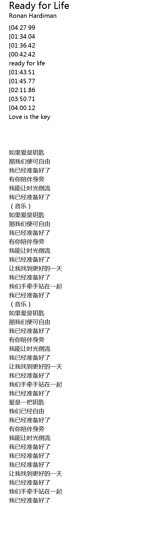 | [00:32.88][00:42.42][01:38.91][01:48.11][01:57.55][02:07.13][03:36.45][03:46.02][03:55.24][04:04.74][04:14.18][04:23.68][04:32.79][04:42.30][04:51.68][05:01.32] | I'm ready for life |