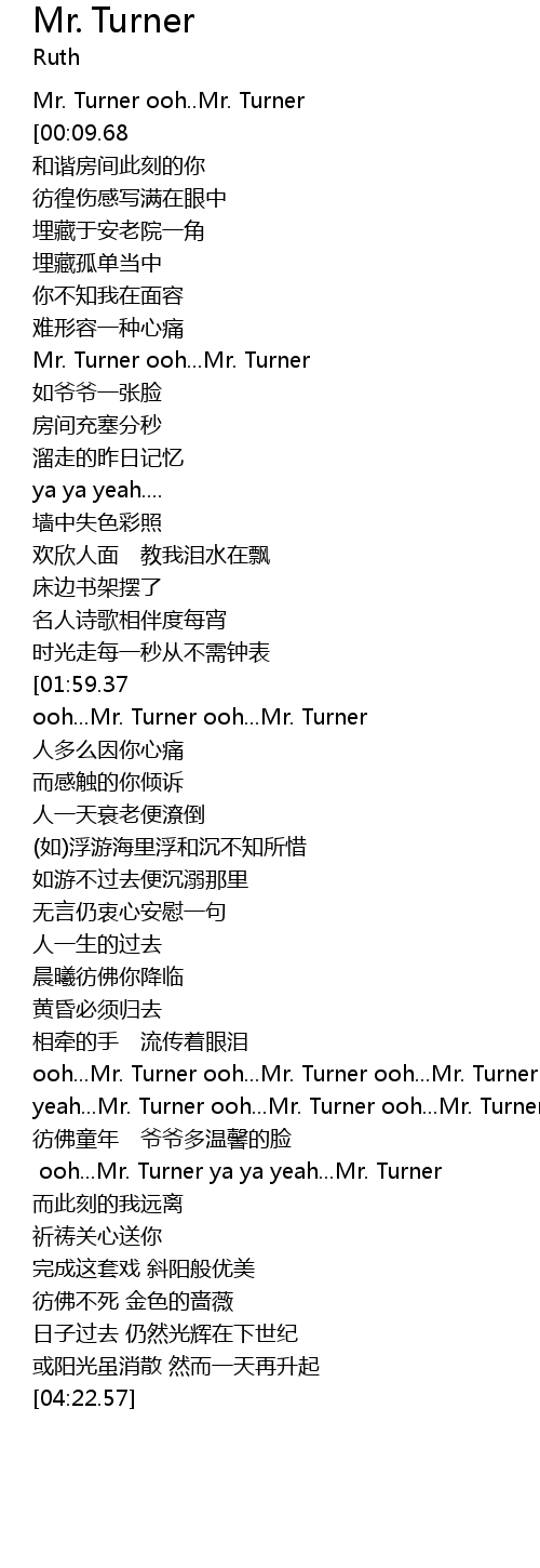 | [03:33.57][01:59.37] | Mr. Turner ooh... Mr. Turner |