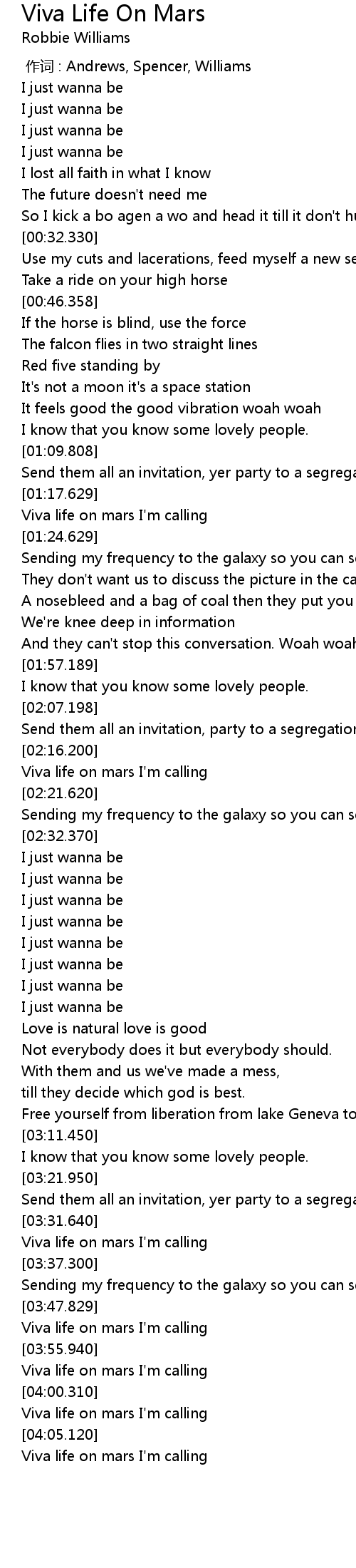 | [02:18.190] | Viva life on mars I' m calling |