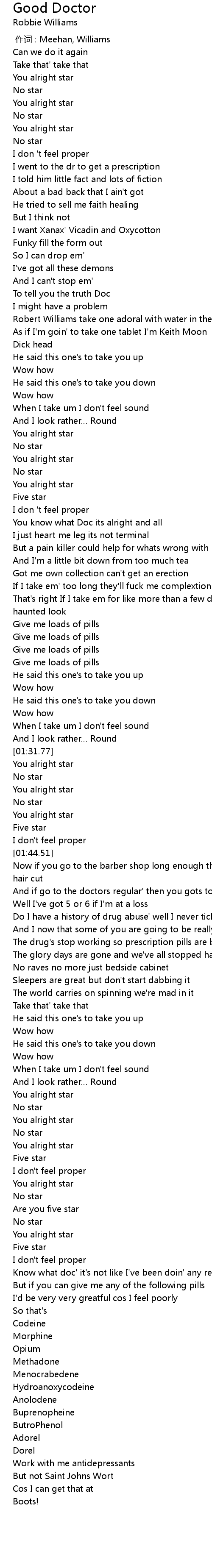 | [00:22.19] | I want Xanax' Vicadin and Oxycotton |
